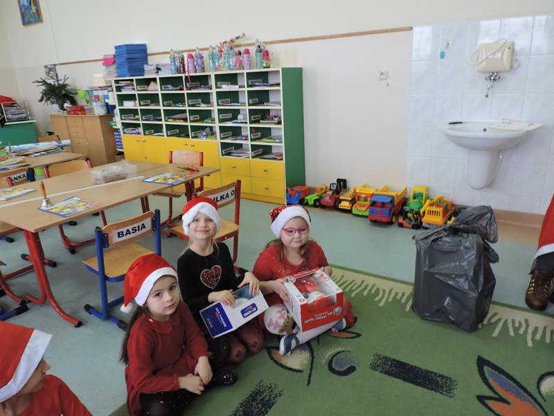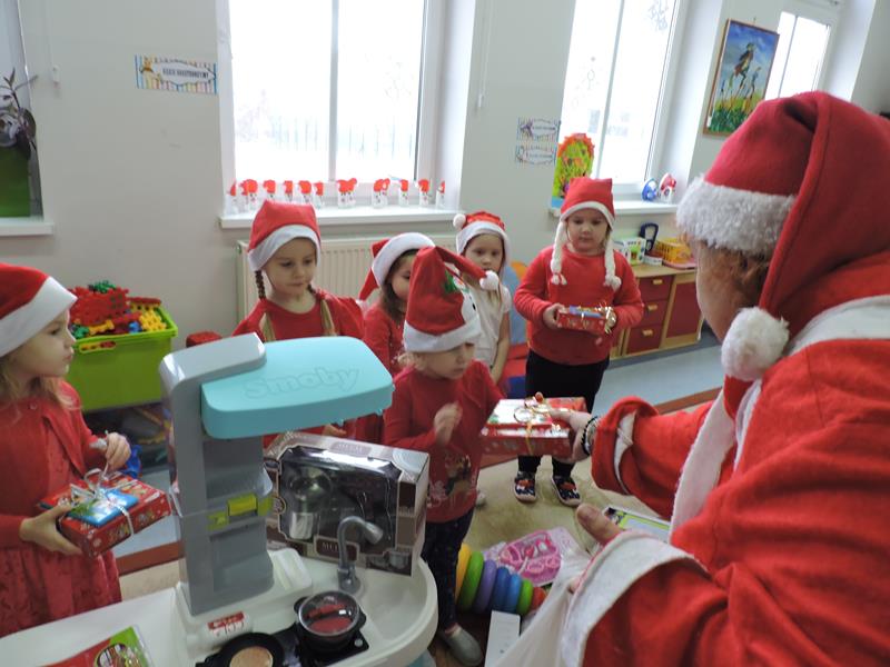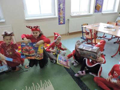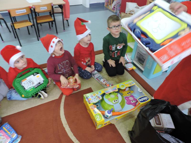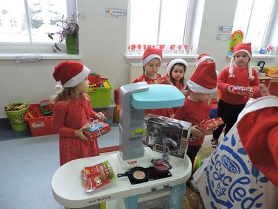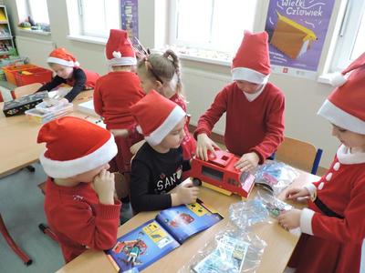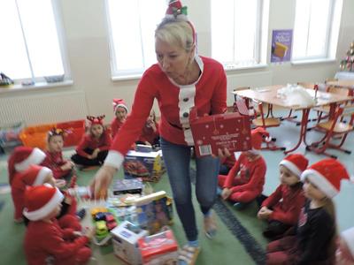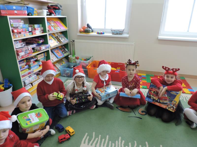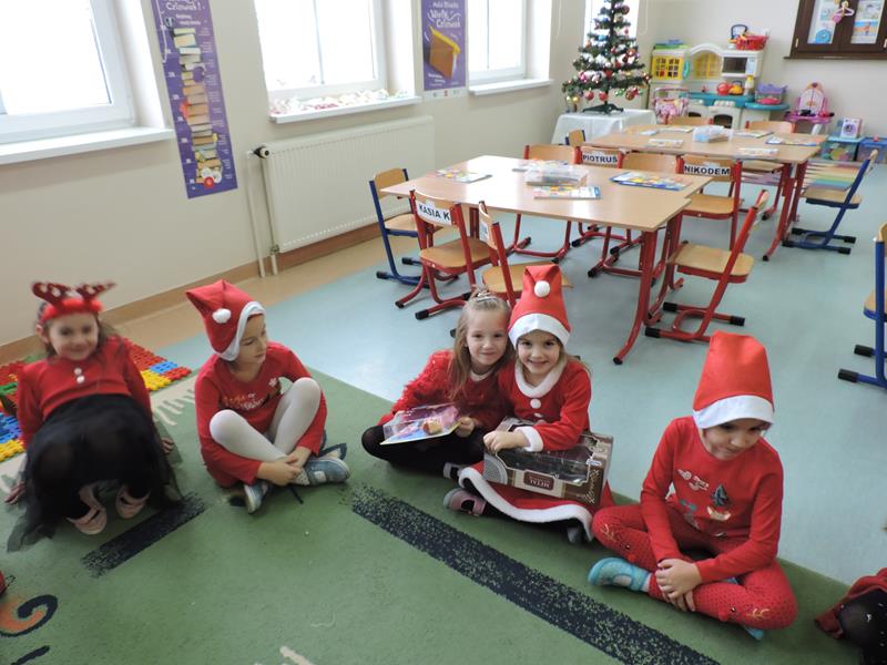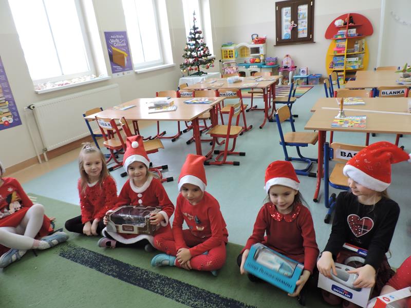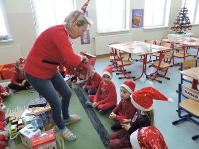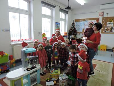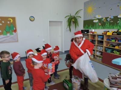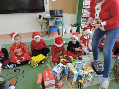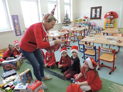 W dzisiejszy Mikołajkowy dzień w szkole i przedszkolu od rana pojawiali się Mikołaje i piękne Mikołajki. Dzieci bardzo zaangażowały się w „bycie Mikołajami” i przyszły w mikołajowych czapkach i czerwonych strojach. Zerówkowicze i przedszkolaki z niecierpliwością oczekiwały przyjścia Mikołaja, mając nadzieję, że przyniesie prezenty. I oczywiście doczekali się – co prawda Mikołaj nie przybył osobiście, ale w zastępstwie wysłał panią Lidkę i to ona wręczyła dzieciom prezenty. Było bardzo wiele radości, bo w tym roku prezentów było bardzo, bardzo dużo. Przedszkolaki dostały nową kuchnię z akcesoriami, lalki, samochody, puzzle, tablice magnetyczne. Zerówkowicze dostali dwa zestawy Playmobil, klocki Korbo, klocki magnetyczne, lalki, nowe garnki do kuchenki, mikser, ekspres do kawy, samochody, a także grę Twister. Dzieci tak wciągnęła zabawa nowymi zabawkami, że nie chciały iść do domu. Na spotkanie z wysłannikiem Mikołaja "załapała" się klasa VIII. Dziękujemy, Mikołaju!