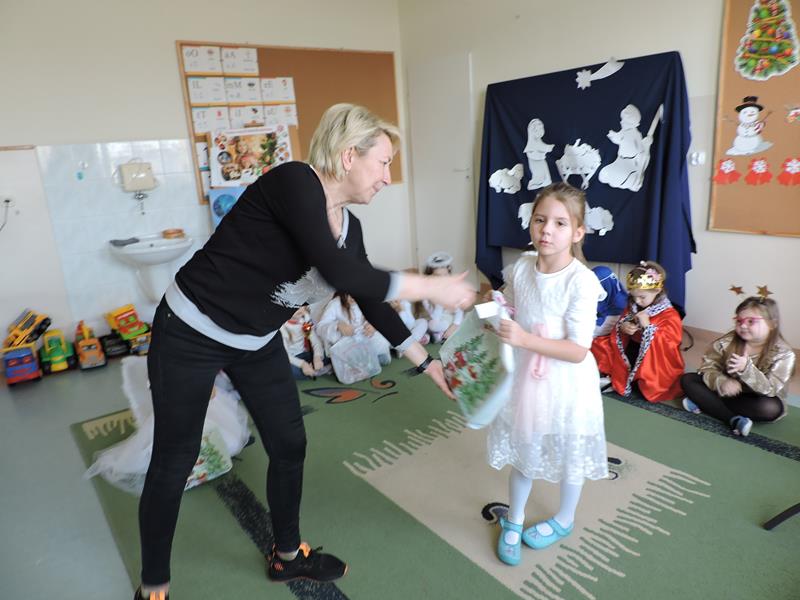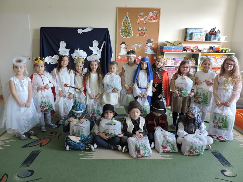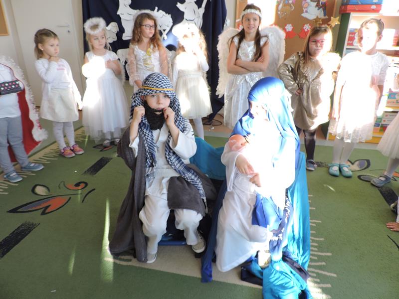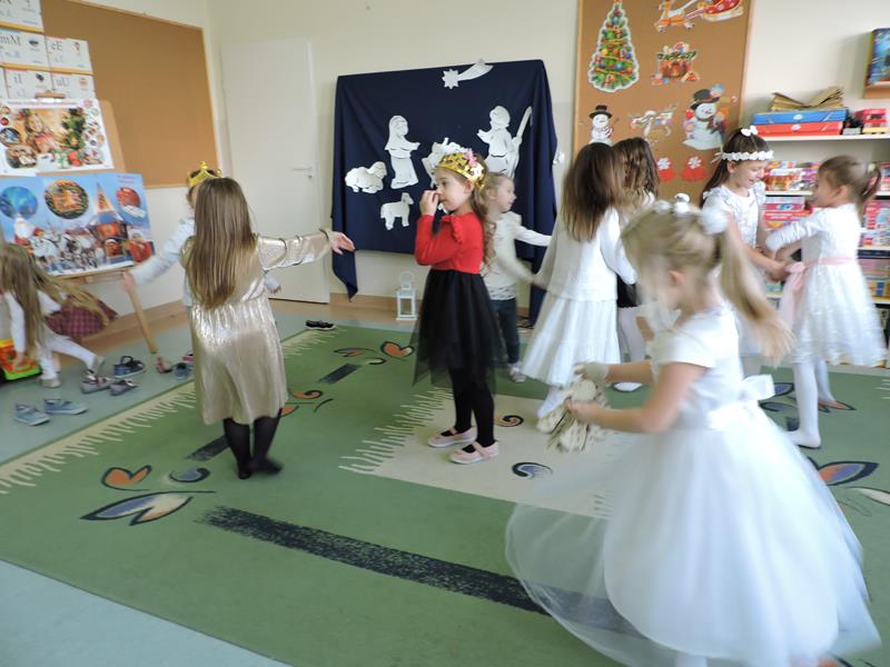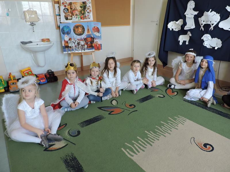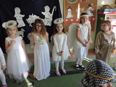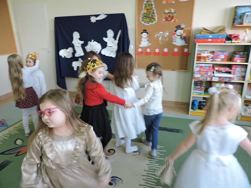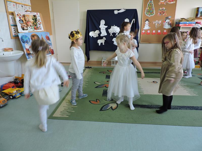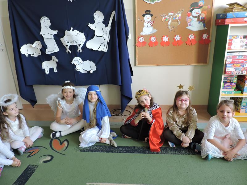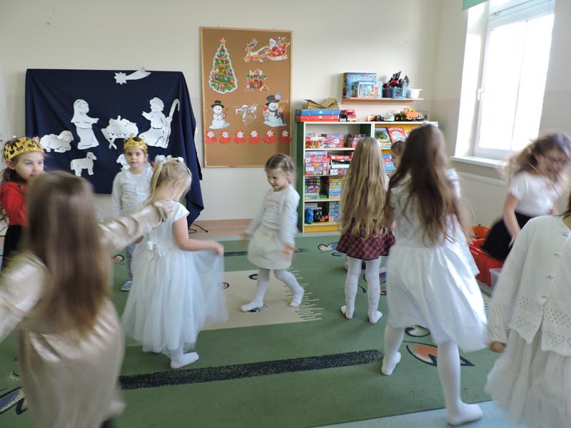Tradycyjnie, jak co roku, zerówkowicze przygotowali jasełkowe przedstawienie. W tym roku swój występ nagrywali, aby mogli obejrzeć go rodzice, koledzy, koleżanki. Na szczęście na widowni zasiadła Pani Dyrektor, która swą obecnością sprawiła dzieciom dużą radość. Dzieci bardzo profesjonalnie przygotowały się do występu – pięknie wyuczyły się swoich ról, a dzięki zaangażowaniu rodziców wystąpiły w pięknych strojach. Występ był bardzo udany. Po występie na dzieci czekała niespodzianka – prezenty od Świętego Mikołaja. Dzień zerówkowicze zakończyli „Anielskimi tańcami” przy kolędach.