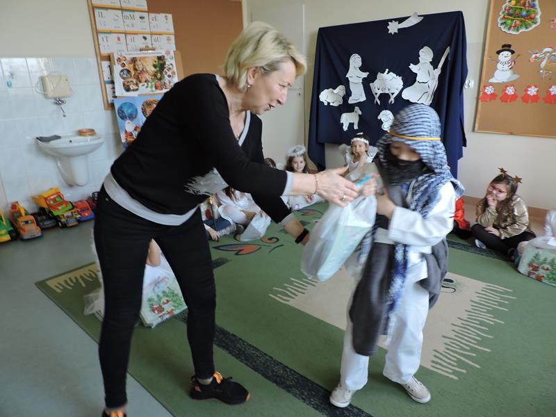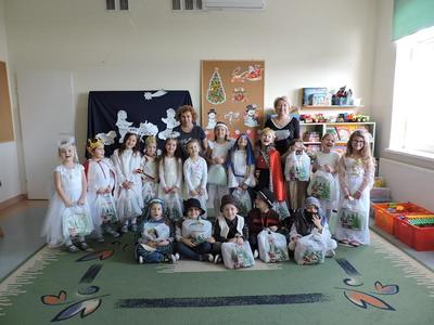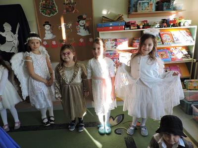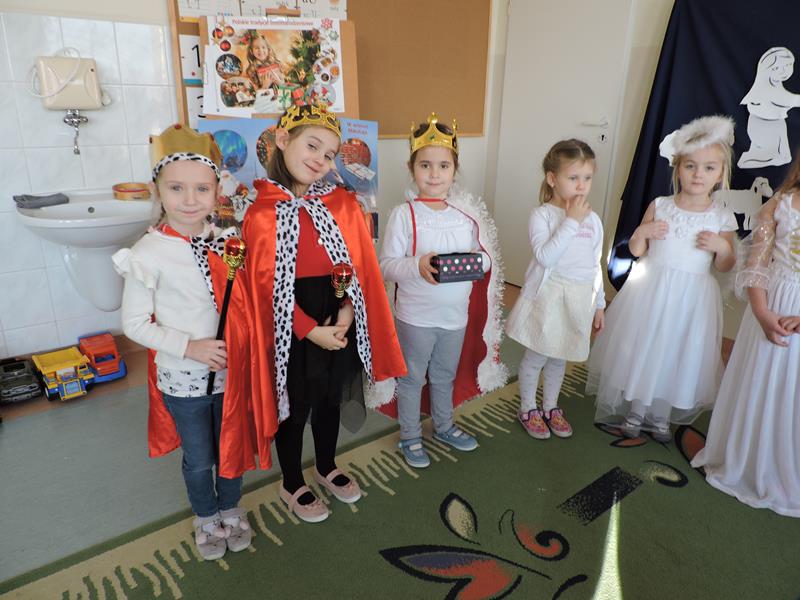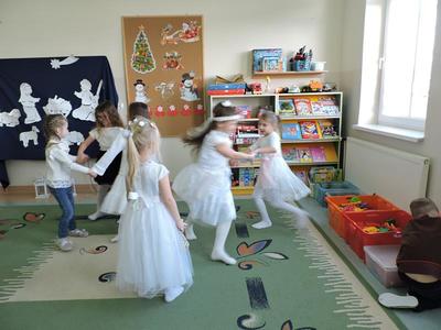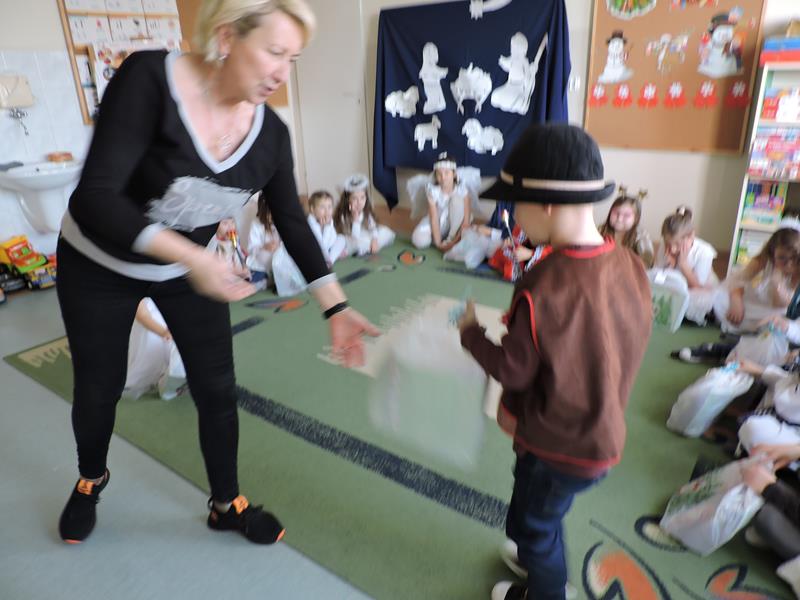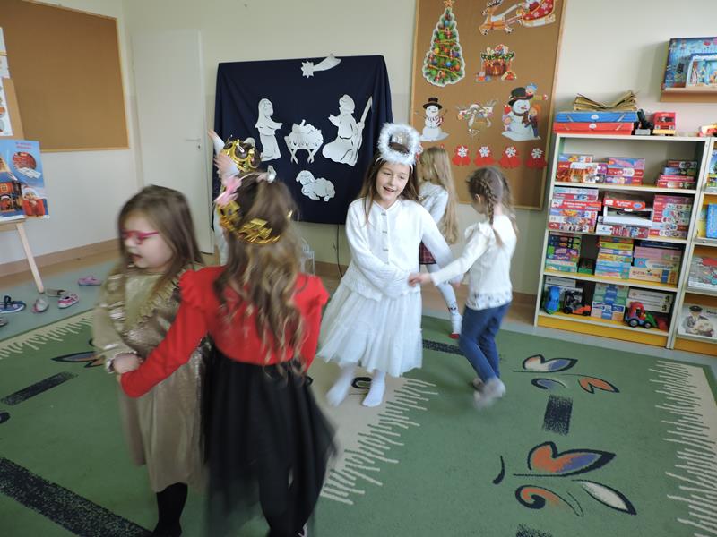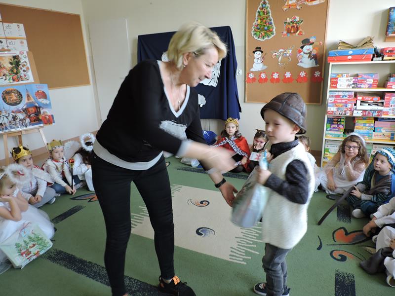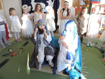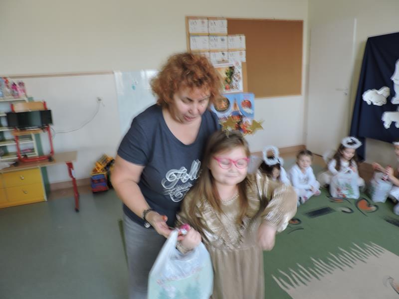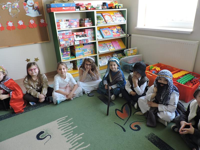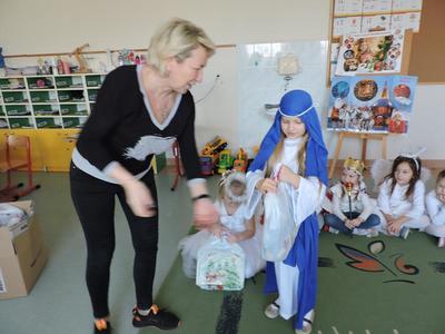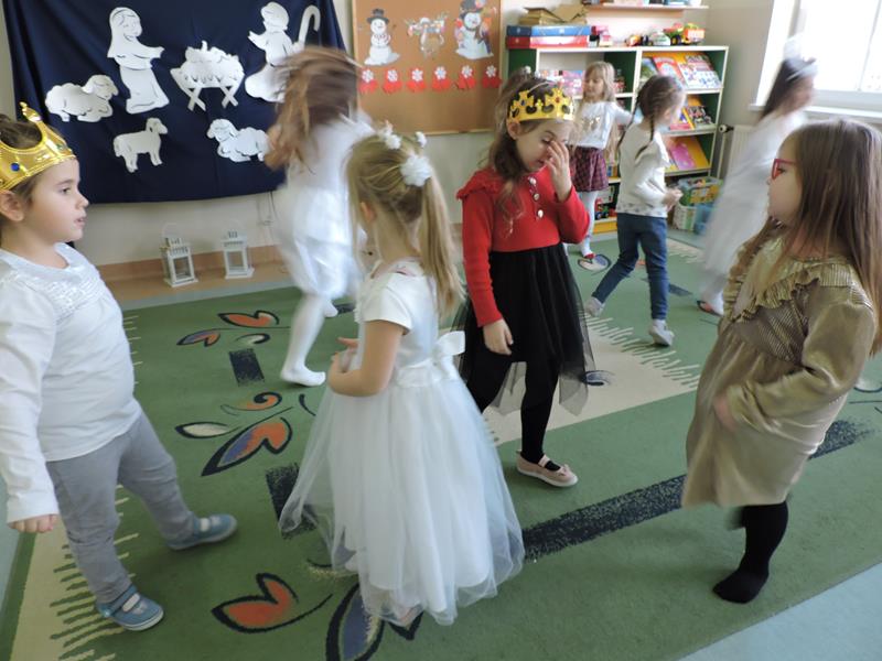 Tradycyjnie, jak co roku, zerówkowicze przygotowali jasełkowe przedstawienie. W tym roku swój występ nagrywali, aby mogli obejrzeć go rodzice, koledzy, koleżanki. Na szczęście na widowni zasiadła Pani Dyrektor, która swą obecnością sprawiła dzieciom dużą radość. Dzieci bardzo profesjonalnie przygotowały się do występu – pięknie wyuczyły się swoich ról, a dzięki zaangażowaniu rodziców wystąpiły w pięknych strojach. Występ był bardzo udany. Po występie na dzieci czekała niespodzianka – prezenty od Świętego Mikołaja. Dzień zerówkowicze zakończyli „Anielskimi tańcami” przy kolędach.