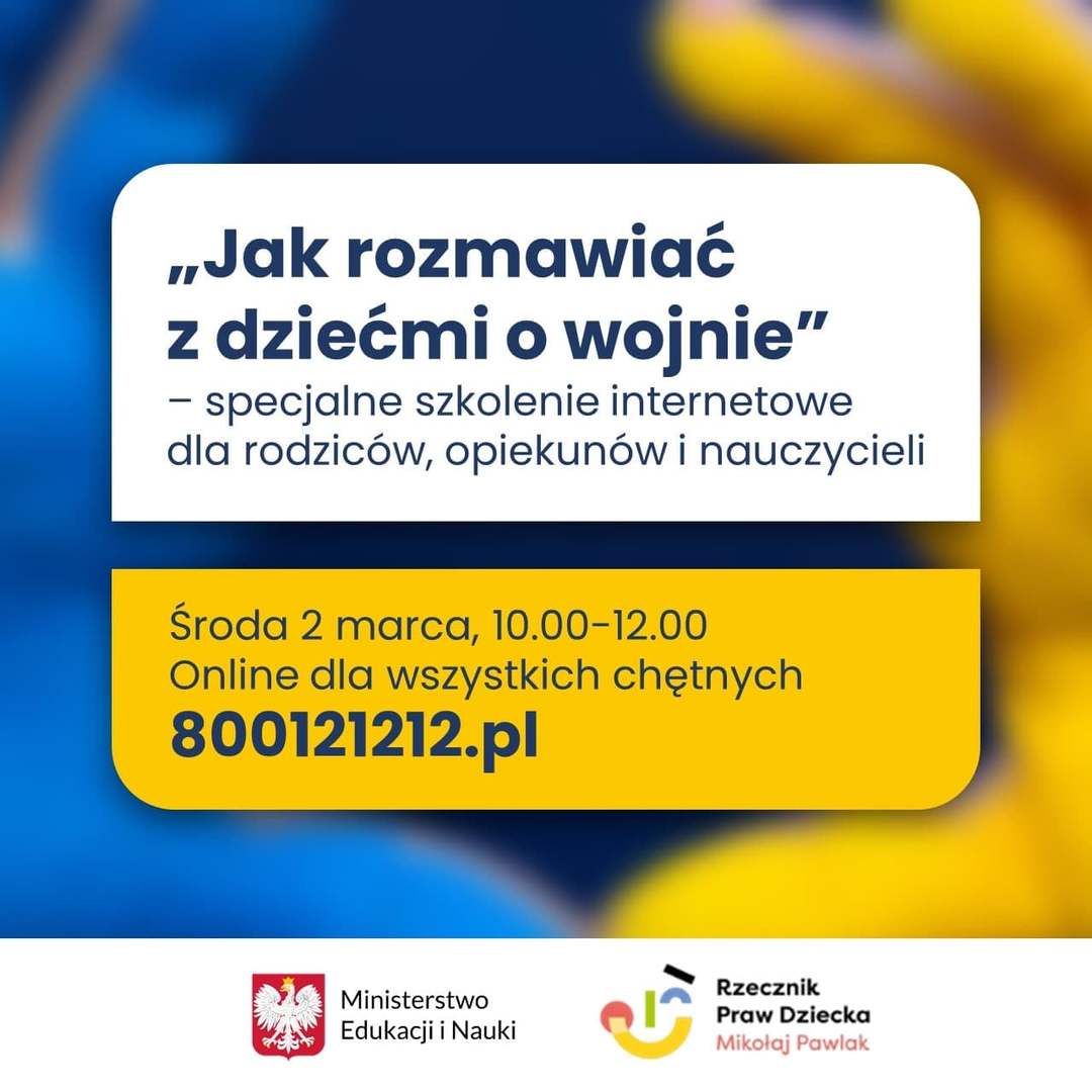 Rzecznik Praw Dziecka wraz z ekspertami z Dziecięcego Telefonu Zaufania organizuje specjalne internetowe szkolenie „Jak rozmawiać z dziećmi o wojnie”. Wydarzenie skierowane będzie do rodziców, opiekunów i nauczycieli, aby pomóc wytłumaczyć dzieciom i młodzieży obecną sytuację. Szkolenie odbędzie się w środę 2 marca w godzinach 10-12. Połączenie online będzie otwarte dla wszystkich chętnych na stronie internetowej 800121212.pl.