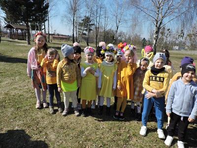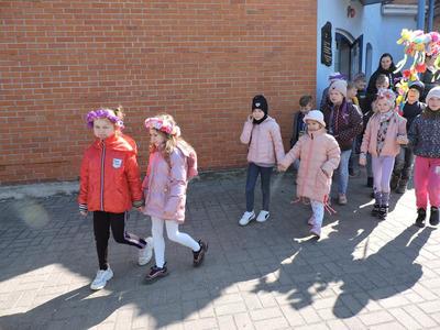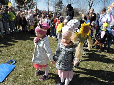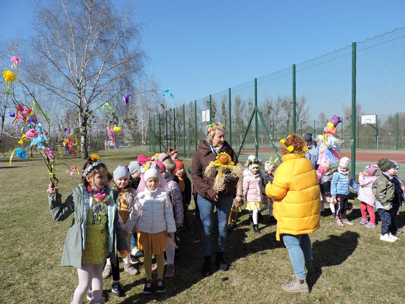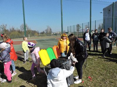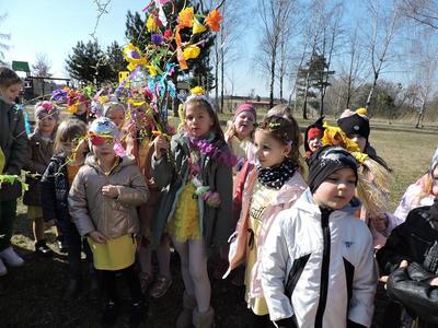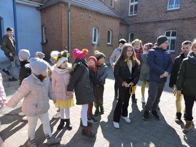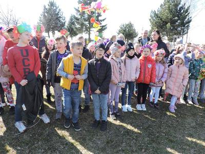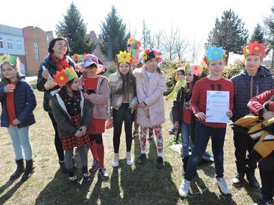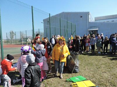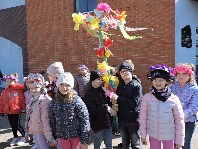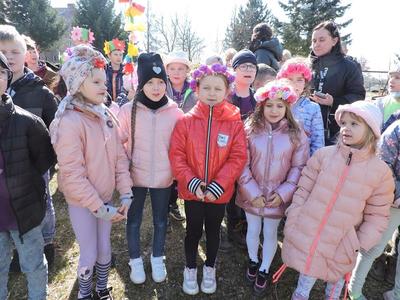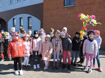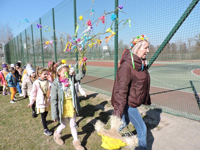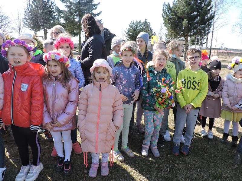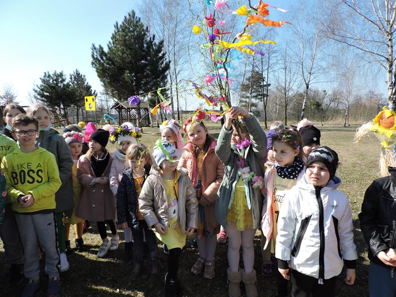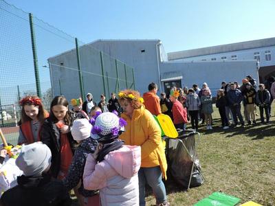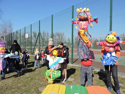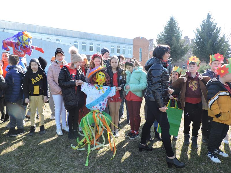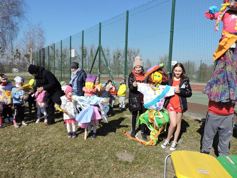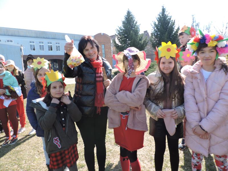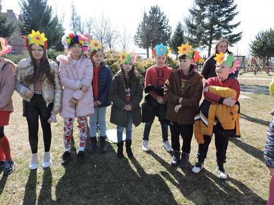 Dziś pierwszy dzień kalendarzowej wiosny. Tradycyjnie więc cała społeczność naszej szkoły wyszła barwnym korowodem na boisko, aby pożegnać zimę reprezentowaną przez Kukłę Marzanny i powitać Wiosnę symbolicznym Gaikiem. Aby było ekologicznie przedstawiciele klas posegregowali Marzanny do odpowiednich pojemników na śmieci. Zerówkowicze oraz uczniowie klas I – III zaśpiewali piosenki o tematyce wiosennej. Do wspólnego śpiewania włączyli się również uczniowie klas starszych z piosenką „Wiosna”. Dzisiejszego dnia uczniowie poszczególnych klas przyszli do szkoły ubrani w barwy, które klasa kilka dni temu wylosowała. Podczas witania wiosny została wybrana najbardziej kolorowa klasa. Zwyciężyła klasa III, tuż za nimi uplasowała się zerówka. W szkole na korytarzu stanęła Fotobudka – postać Pani Wiosny. Wszyscy chętni mogli zrobić sobie zdjęcie i przez chwilę być Wiosną.