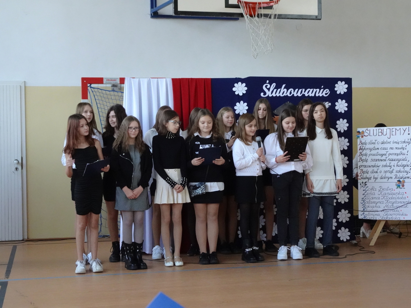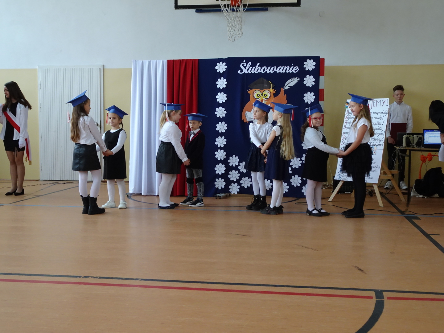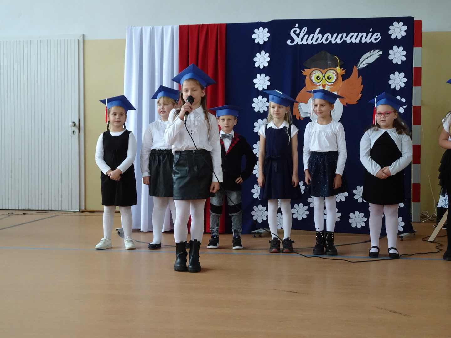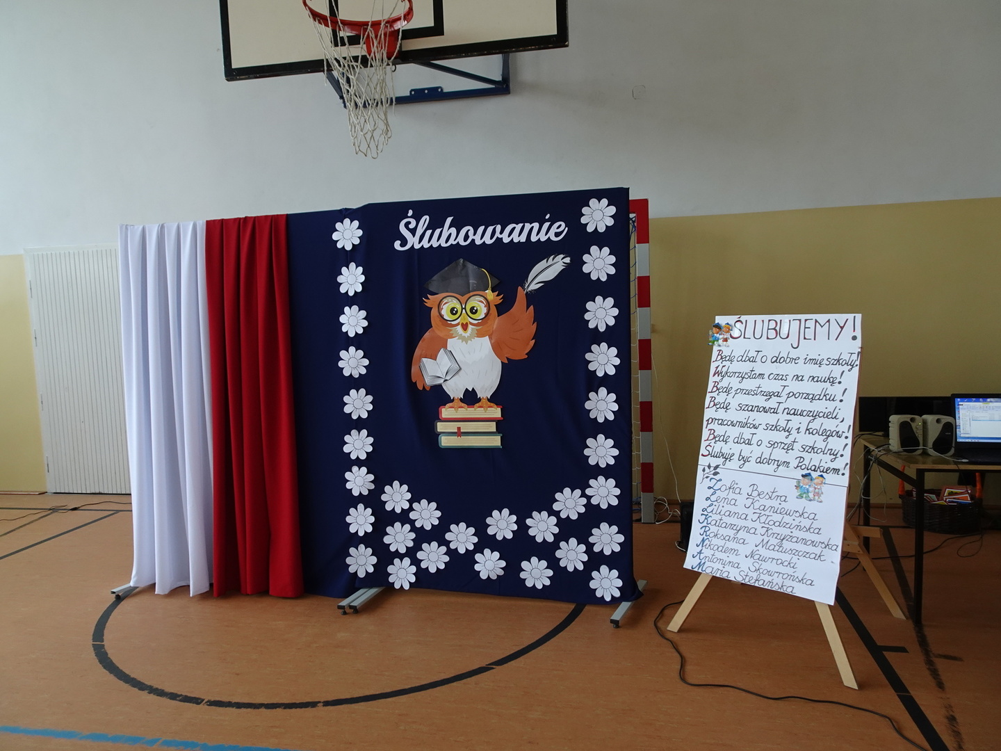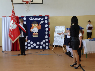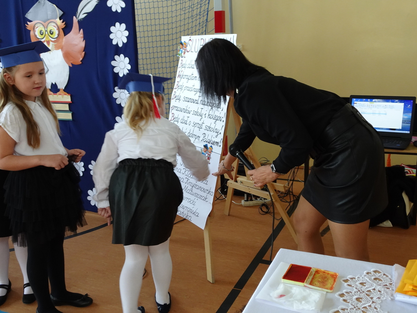 W niezwykle podniosłej atmosferze, przed pocztem sztandarowym uczniowie klasy pierwszej ślubowali być dobrymi Polakami, godnie reprezentować swoją szkołę, swym zachowaniem i nauką sprawiać radość rodzicom i nauczycielom. Po złożeniu ślubowania dyrekcja szkoły dokonała symbolicznego pasowania na ucznia. Od tej chwili stali się oni nowymi członkami naszej wielkiej szkolnej rodziny!