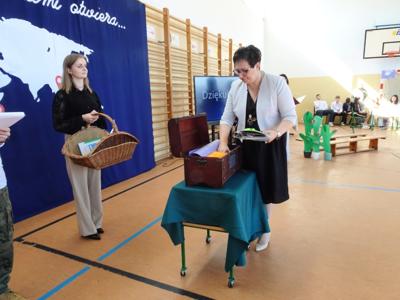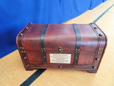 Pani Dyrektor umieściła w kapsule: wspólne zdjęcie całej społeczności szkolnej, aktualne podręczniki z matematyki oraz biologii, spis nauczycieli oraz pozostałych pracowników Zespołu Szkolno – Przedszkolnego w Kucharkach, regulamin przyznawania odznaki Motyla oraz spis uczniów z ostatnich trzech lat, które takie odznaki otrzymali.