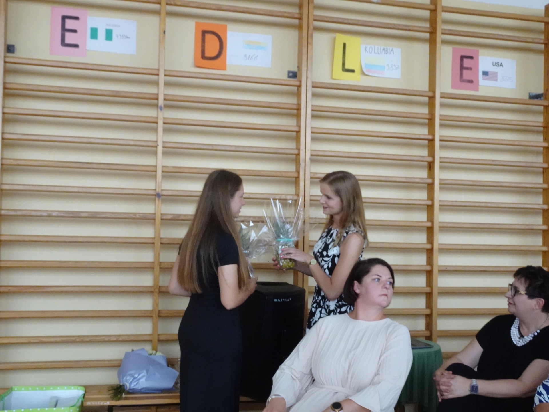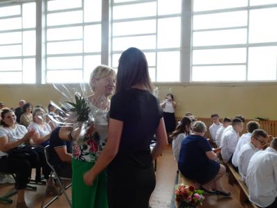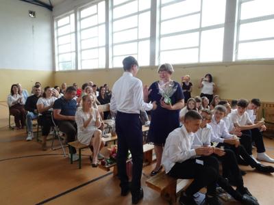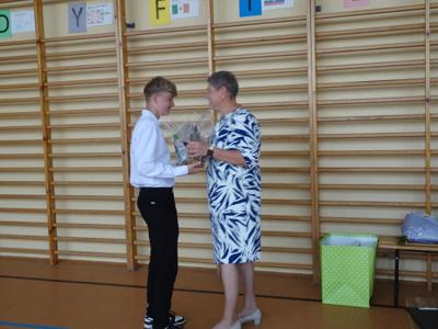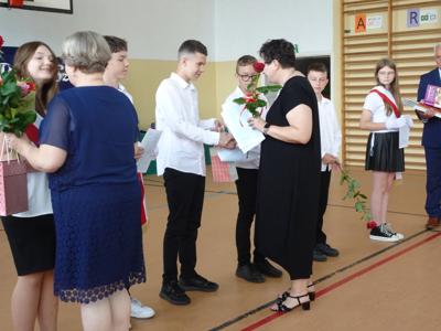 Pani Dyrektor wraz z wychowawcą klasy 8 wręczyli nagrody za wysokie wyniki w nauce.
